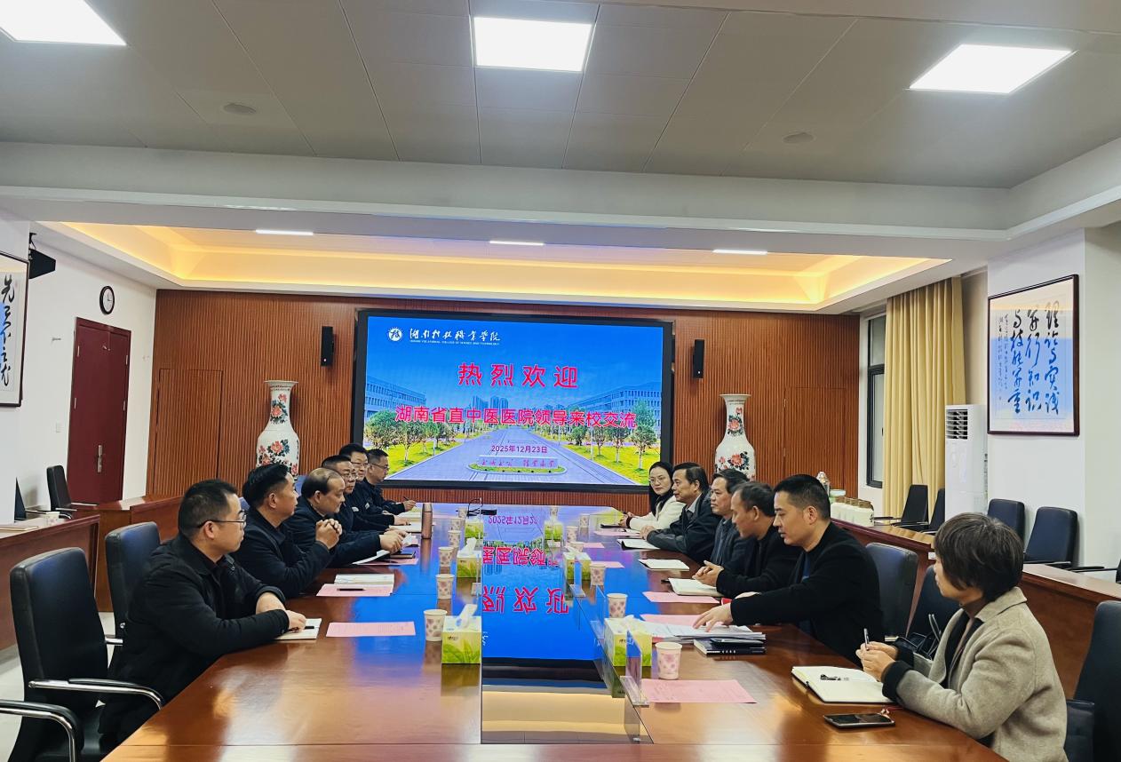 12月23日下午,湖南省直中医医院党委书记伍世葵、院长冯传平带队来我校调研交流。学校党委副书记、校长蒋阳飞,党委副书记邹海,党委委员、纪委书记王平及党政办公室、纪检监察处、药学院等相关人员参加座谈交流。